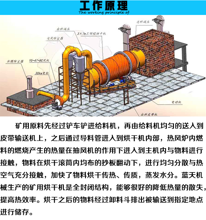 礦用烘干機( 礦用烘干設備)廣泛用于建材,冶金、選礦、化工、水泥等行業(yè),主要用于礦渣、石灰石、粘土、河沙、石英沙、水渣等濕性大、比重大的的物料。礦渣烘干生產線,主要由回轉筒體、引風設備、高速打散設備、揚料板,自清掃裝置、傳動裝置,輸送設備、熱風設備、減速機、支撐裝置及密封裝置等部件組成。