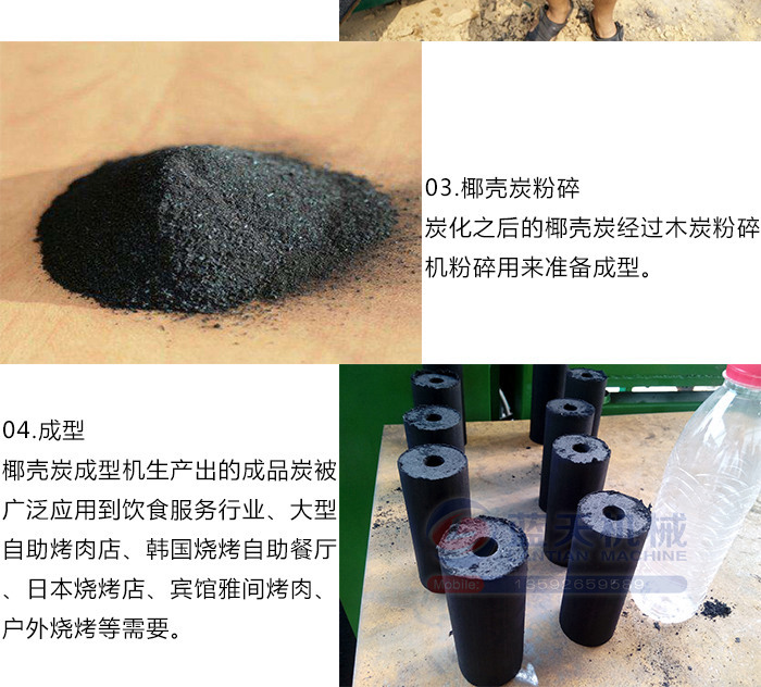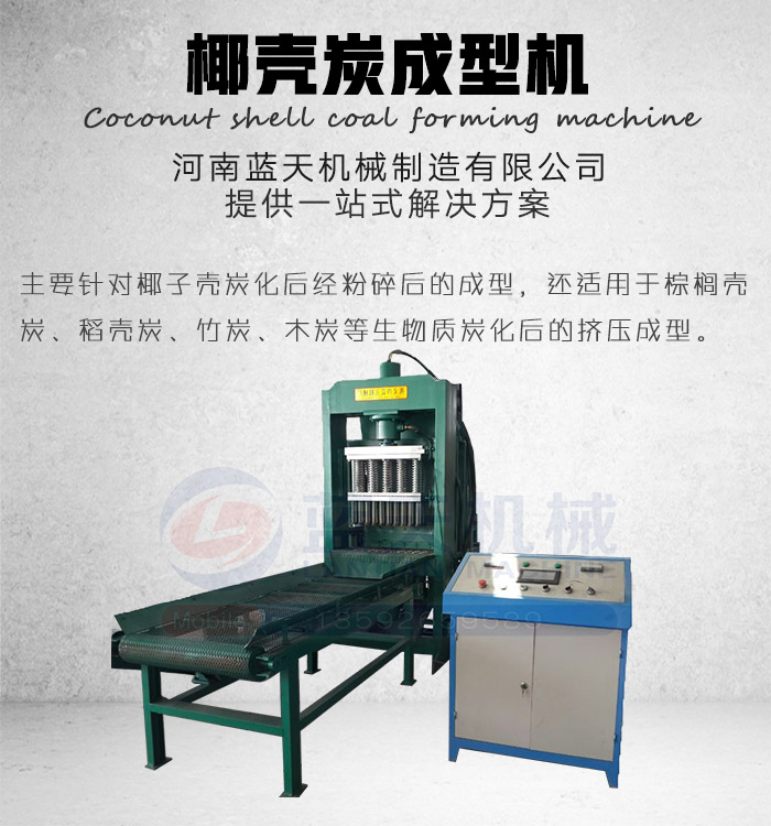 椰殼炭成型機是河南藍天機械制造有限公司生產的炭粉成型產品,主要是將椰殼炭、棕櫚殼炭、稻殼炭、竹炭、木炭等生物質具有碳纖維廢舊物料經炭化后粉碎成型的設備,是機制木炭另外一種炭化工藝。