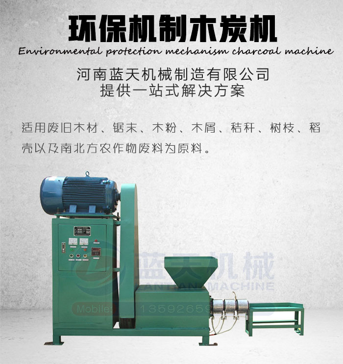 環(huán)保機制木炭機是以廢舊木材、鋸末、木粉、木屑、秸稈、樹枝、稻殼以及南北方農(nóng)作物廢料為原料,粉碎后經(jīng)環(huán)保機制木炭機高溫、高壓塑化后成型為機制木炭半成品,后經(jīng)炭化即為環(huán)保木炭。河南藍天機械制造有限公司是專業(yè)生產(chǎn)環(huán)保機制木炭機設備的廠家,咨詢環(huán)保機制木炭機價格請撥打官網(wǎng)熱線了解更多!環(huán)保機制木炭機是用木材的邊角廢料、樹枝、花生殼、玉米桿、桔桿等南北方農(nóng)作物廢料為原料做木炭等于垃圾換成錢,變廢為寶。在隔絕空氣條件下,經(jīng)高溫高壓機制炭成型機成型、炭化處理后制成的一種廢物再利用的能源,是變污染物為生物資源、發(fā)展農(nóng)業(yè)循環(huán)經(jīng)濟的重要模式。市場價在1.4元/公斤左右,適合用于工業(yè)生產(chǎn)、餐飲業(yè)和居家取暖。